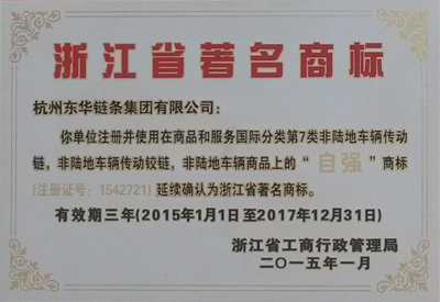 日前,由浙江省工商行政管理局認定,我公司注冊并使用在商品和服務國際分類第7類非陸地車輛傳動鏈,非陸地車輛傳動鉸鏈,非陸地車輛商品上的“自強”商標延續(xù)確認為浙江省著名商標。有效期為2015年1月1日至2017年12月31日。