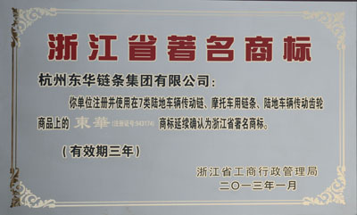 日前,東華集團注冊并使用在7類陸地車輛傳動鏈、摩托車用鏈條、陸地車輛傳動齒輪商品上的“東華”(注冊證號:943174)商標被浙江省工商行政管理局延續(xù)確認為浙江省著名商標,有效期三年。這是2004年 “東華”商標被認定為浙江省著名商標后連續(xù)被延續(xù)確認。