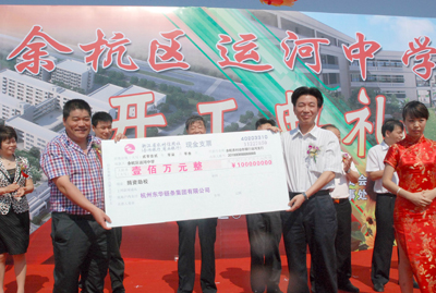 7月3日,烈日炎炎,在運河中學舉行的開工典禮上,東華集團董事長宣碧華熱心參與余杭區(qū)運河鎮(zhèn)組織的“捐資助?!すΦ虑铩贝壬凭栀浕顒樱蜻\河中學建校捐款100萬元,為“運河中學”建設項目添磚加瓦,充分體現(xiàn)了東華集團關(guān)心、支持教育事業(yè)的拳拳愛心。