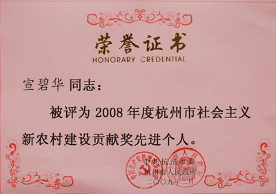 日前,東華鏈條集團董事長宣碧華被中共杭州市委、杭州市人民政府授予 “2008年度杭州市社會主義新農(nóng)村建設(shè)貢獻獎先進個人”榮譽稱號。