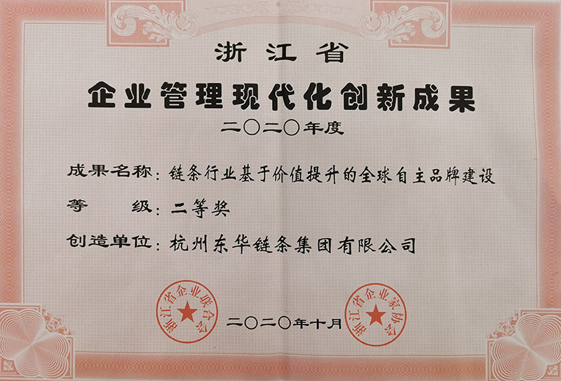 日前,公司申報的“鏈條行業(yè)基于價值提升的全球自主品牌建設”項目分別榮獲浙江省和杭州市2020年度企業(yè)管理現(xiàn)代化創(chuàng)新成果二等獎稱號,這是企業(yè)連續(xù)多年在企業(yè)管理創(chuàng)新成果中獲獎。