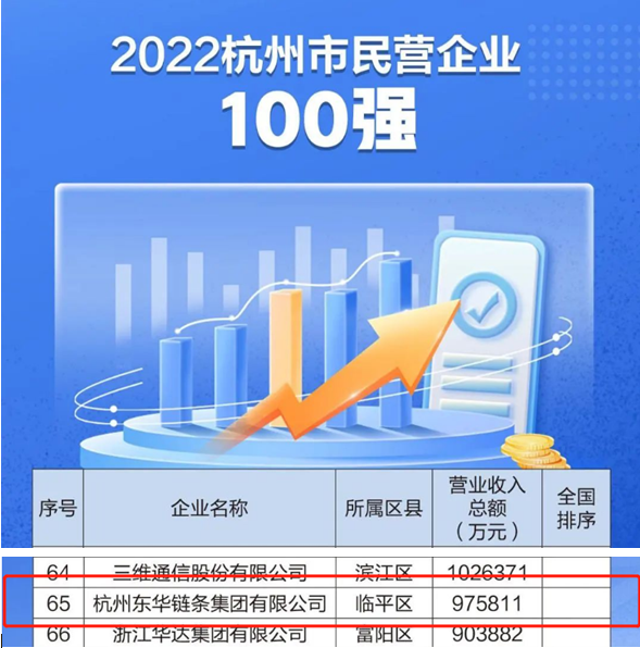 東華鏈條集團分別榮登“2022杭州市民營企業(yè)100強”第65位;“ 2022杭州市民營企業(yè)制造業(yè)50強”第34位;“2022杭州市民營企業(yè)就業(yè)50強”第43位;“2022杭州市民營企業(yè)研發(fā)投入50強”第46位。其中,“2022杭州市民營企業(yè)100強”入圍門檻為33.68億元,有41家企業(yè)入選“2022中國民營企業(yè)500強”。