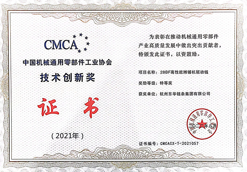 東華鏈條榮獲特等獎(jiǎng)、優(yōu)秀獎(jiǎng)各5項(xiàng)。5項(xiàng)特等獎(jiǎng)分別是:東華鏈條集團(tuán)開(kāi)發(fā)的28BF高性能攤鋪機(jī)驅(qū)動(dòng)鏈、東華興化公司開(kāi)發(fā)的32BSPF高精度高耐磨鏈條、盾牌公司開(kāi)發(fā)的P224.7F1驅(qū)動(dòng)輸送鏈和M224F-S-250地拖輸送鏈、自強(qiáng)公司開(kāi)發(fā)的C-24SSLR自潤(rùn)滑梯級(jí)鏈條;5項(xiàng)優(yōu)秀獎(jiǎng)產(chǎn)品及高端裝備分別是:東華鏈條集團(tuán)開(kāi)發(fā)的2.0T汽車發(fā)動(dòng)機(jī)用靜音鏈條、東華興化公司開(kāi)發(fā)的C2062HSSGR高耐磨輸送鏈、盾牌公司開(kāi)發(fā)的P200F280K2輸送鏈、HB50.5F41空心銷軸鏈條鉚頭機(jī)和PO152F48棕櫚油輸送鏈裝配機(jī)。