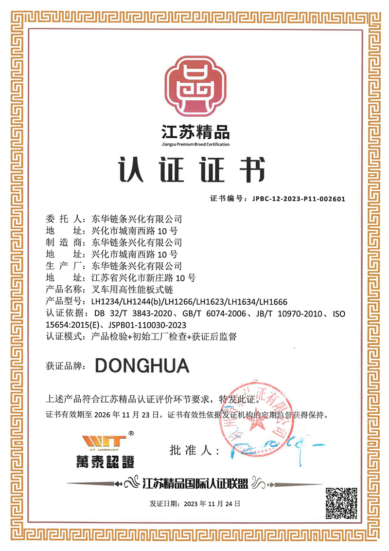 近日,東華鏈條興化有限公司叉車用高性能板式鏈獲得由江蘇精品國際認證聯(lián)盟頒發(fā)的“江蘇精品”認證證書,這是板式鏈產品繼“浙江制造”品字標的又一項榮譽,是板式鏈產品從2022年開始在江蘇興化工廠制造的第一項省級榮譽。