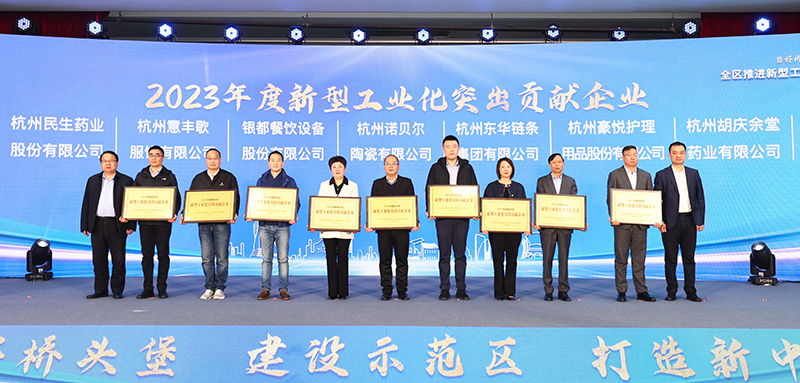 會(huì)上,東華鏈條獲得“2023年度新型工業(yè)化突出貢獻(xiàn)企業(yè)”、“2023年度數(shù)實(shí)融合示范企業(yè)”稱號(hào)。集團(tuán)董事長(zhǎng)宣成參加會(huì)議并上臺(tái)(右五)領(lǐng)獎(jiǎng)。