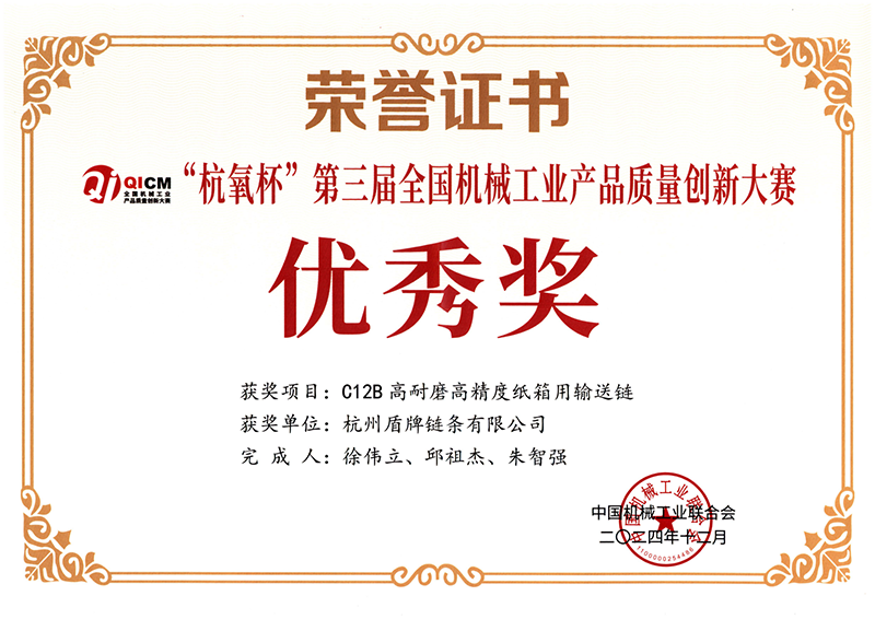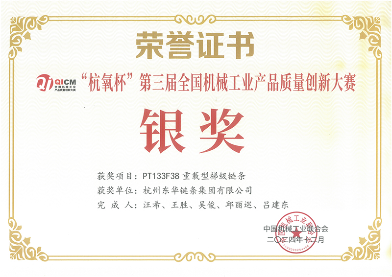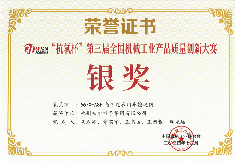 會上,頒發(fā)了“杭氧杯”第三屆全國機(jī)械工業(yè)產(chǎn)品質(zhì)量創(chuàng)新獎。東華榮獲兩項銀獎和一項優(yōu)秀獎。銀獎分別是由扶梯工程鏈?zhǔn)聵I(yè)部選送的“PT133F38重載型梯級鏈條”項目和農(nóng)機(jī)鏈?zhǔn)聵I(yè)部選送的“667X-ASF高性能農(nóng)用車輸送鏈”項目,由盾牌鏈條選送的“C12B高耐磨高精度紙箱用輸送鏈”榮獲優(yōu)秀獎。項目負(fù)責(zé)人上臺領(lǐng)獎。