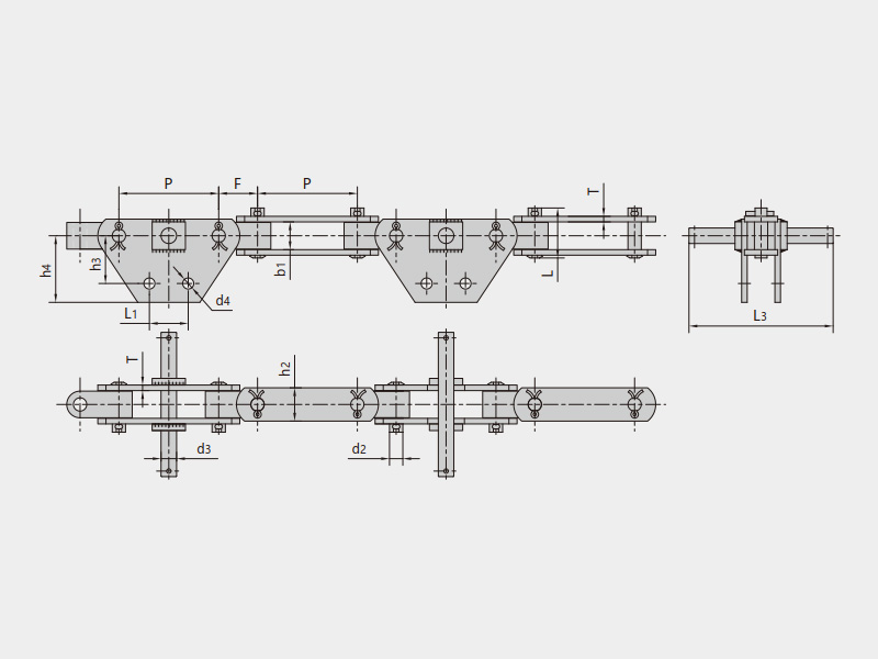 ● 雙鉸接輸送鏈結(jié)構(gòu)繁多,JB/T 8546標(biāo)準(zhǔn)中的典型結(jié)構(gòu)有A型結(jié)構(gòu)(雙鏈板雙走輪單導(dǎo)輪)、 S型結(jié)構(gòu)(雙鏈板雙走輪雙導(dǎo)輪)、Q型結(jié)構(gòu)(輕型的雙鏈板雙走輪雙導(dǎo)輪) ,實(shí)現(xiàn)在軌道中的正確定位與減少運(yùn)行阻力。